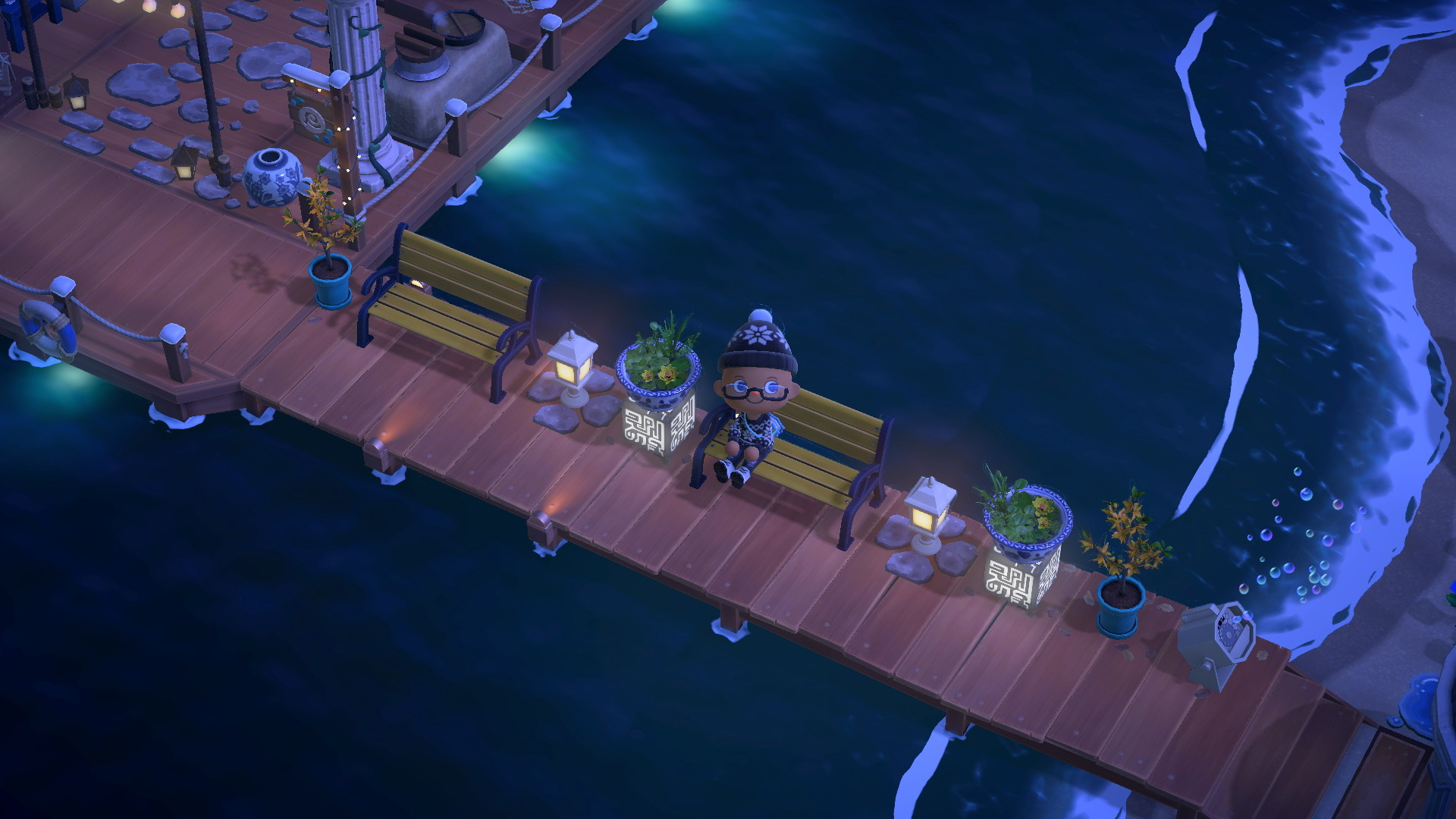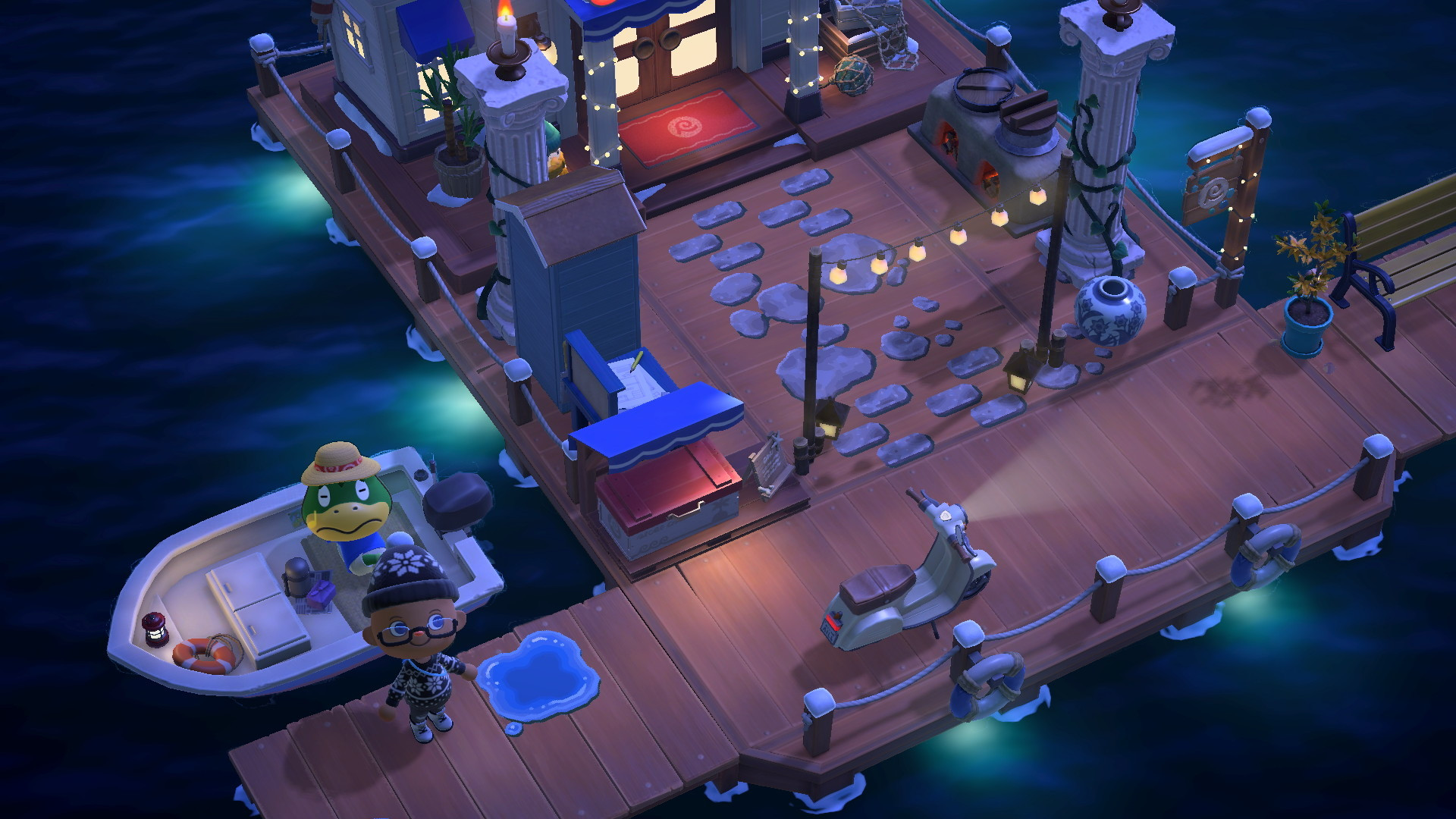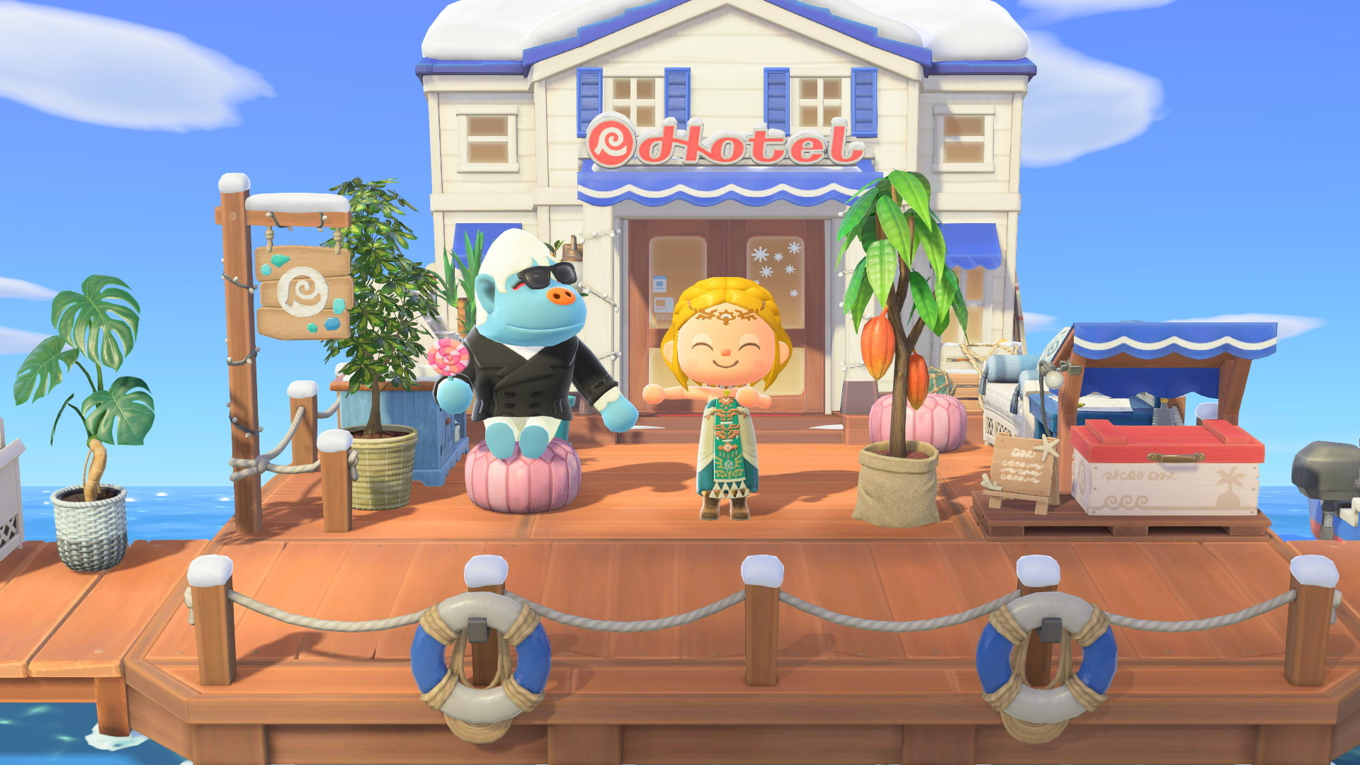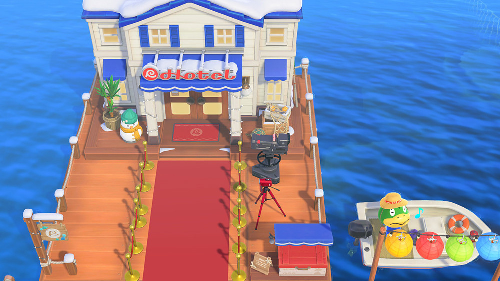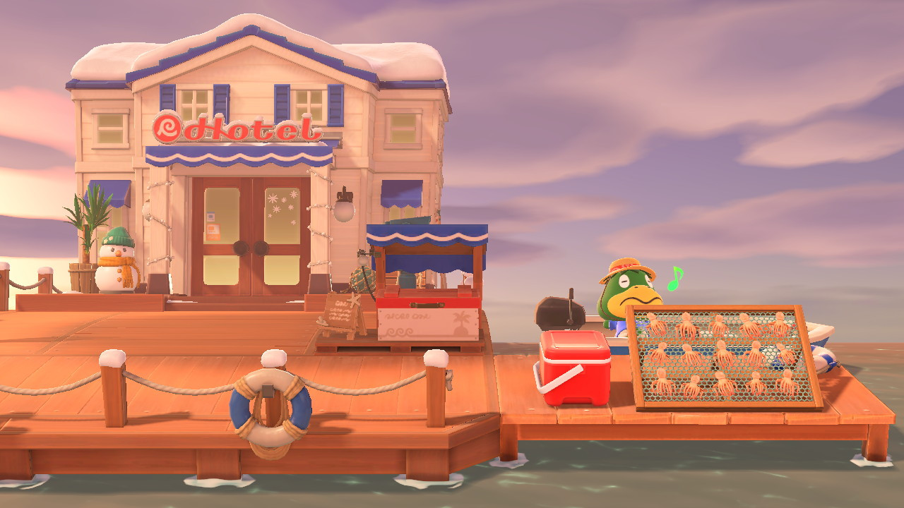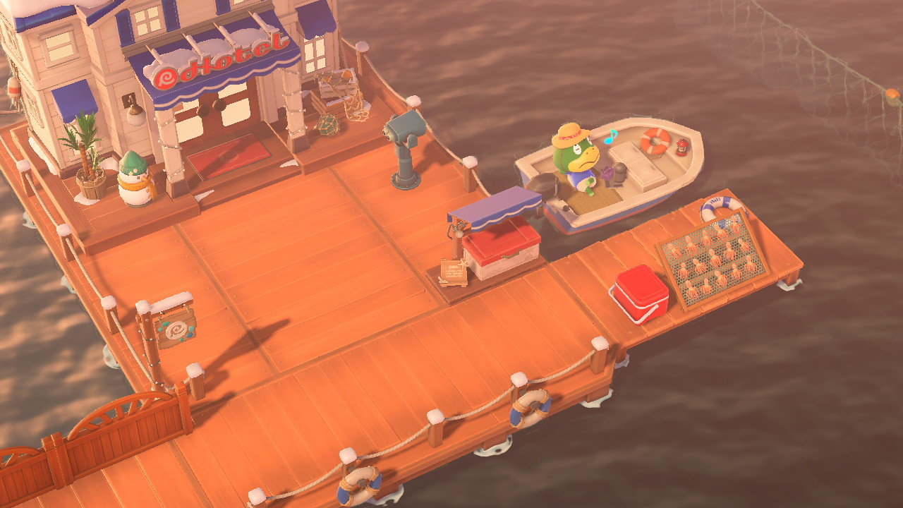 Käpptn chillt den ganzen lieben Tag in seinem Boot, während seine geangelten Oktopoden auf dem Trockenständer zum Trocknen ausliegen. Vor dem 3.0-Update standen dort zwei Trockenständer und ein orange-weißer Rettungsring (passend zu dem anderen Rettungsring in Käpptns Boot). Mich stört es ein bisschen, dass die Rettungsringe des Hotels nun blau-weiß sind, während der andere in Käpptns Boot orange geblieben ist.